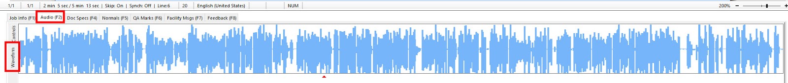 - Waveform: As a compliment to Silence Skip, the ITC will now display the waveform (graphical representation of the audio) as a sub-tab under the Audio (F2) tab. As playback occurs, the red arrow at the bottom will indicate the current audio position. The MT can also use their mouse to click on the waveform to skip to a desired location. The waveform is displayed by clicking the sub-tab highlighted in the first image below, or by pressing Ctrl + F2 (pressing F2 will continue to display the regular Audio Control sub-tab).